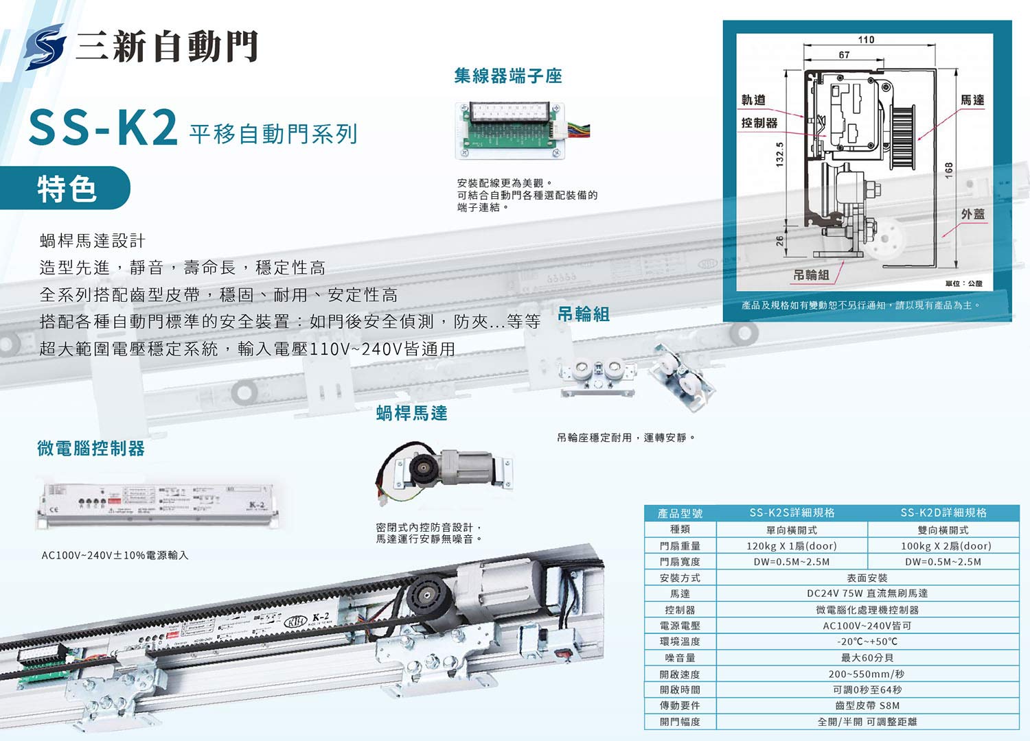1. 蝸桿馬達設計,安裝省空間 2. 造型先進,靜音,壽命長,穩定性高 3. 搭配各種自動門標準的安全裝置:如門後安全偵測,防夾…等等 4. 超大範圍電壓穩定系統,輸入電壓 AC100V~240V 皆通用 5. 全系列搭配齒型皮帶,穩固、耐用、安定性高 6. CE認證:EN 13849、EN16005、EN ISO 12100